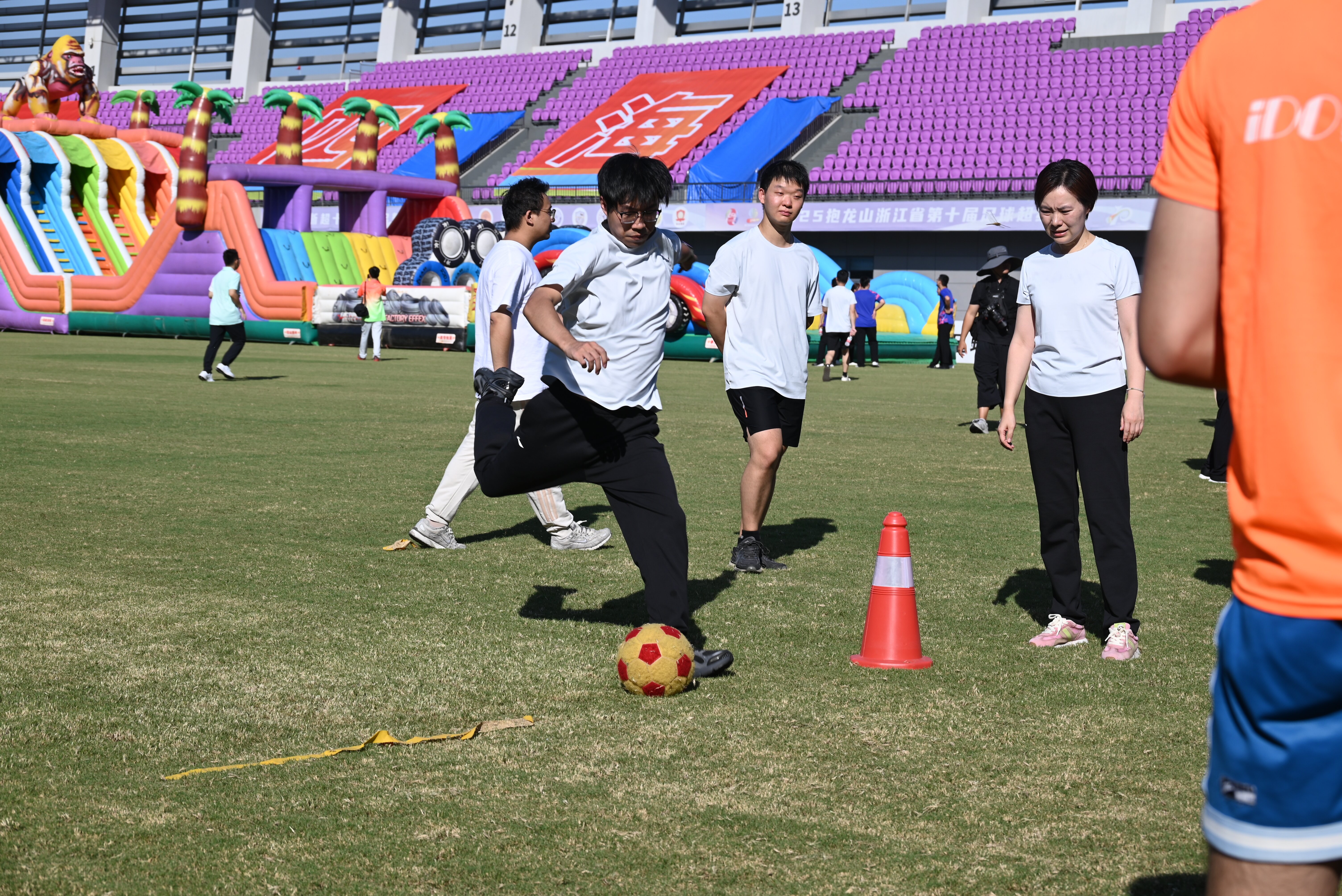 趣味項目環節更是精彩紛呈:“錨定青春”中,隊員們凝神聚氣,發球射門劃出優美弧線,精準投向得分點;“枕頭大作戰”現場歡呼不斷,彩色枕頭在空中飛舞,隊員們默契傳遞、靈活應對,展現了戰術與協作的完美結合;而在“快樂沖沖沖”障礙接力中,四位隊員疾步如風,穿越重重關卡,擊掌接力間盡顯速度與激情。