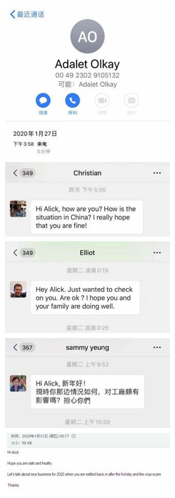作為業務一線的業務部門,業務六部的客戶分布在美國,德國,意大利,荷蘭等國家,在得知疫情的第一時間,各種問候的郵件就雪花片一般地飛來,因為假期在家,業務員沒有第一時間看到郵件,客人就通過微信,甚至直接電話前來詢問是否平安。