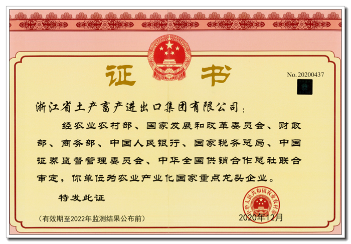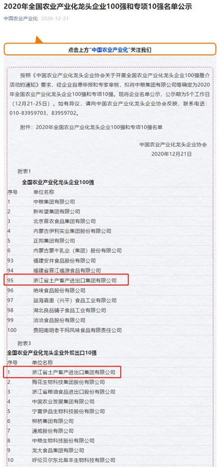 浙江土畜獲“2020年全國農(nóng)業(yè)產(chǎn)業(yè)化龍頭企業(yè)100強(qiáng)”和“外貿(mào)出口10強(qiáng)”兩項榮譽
