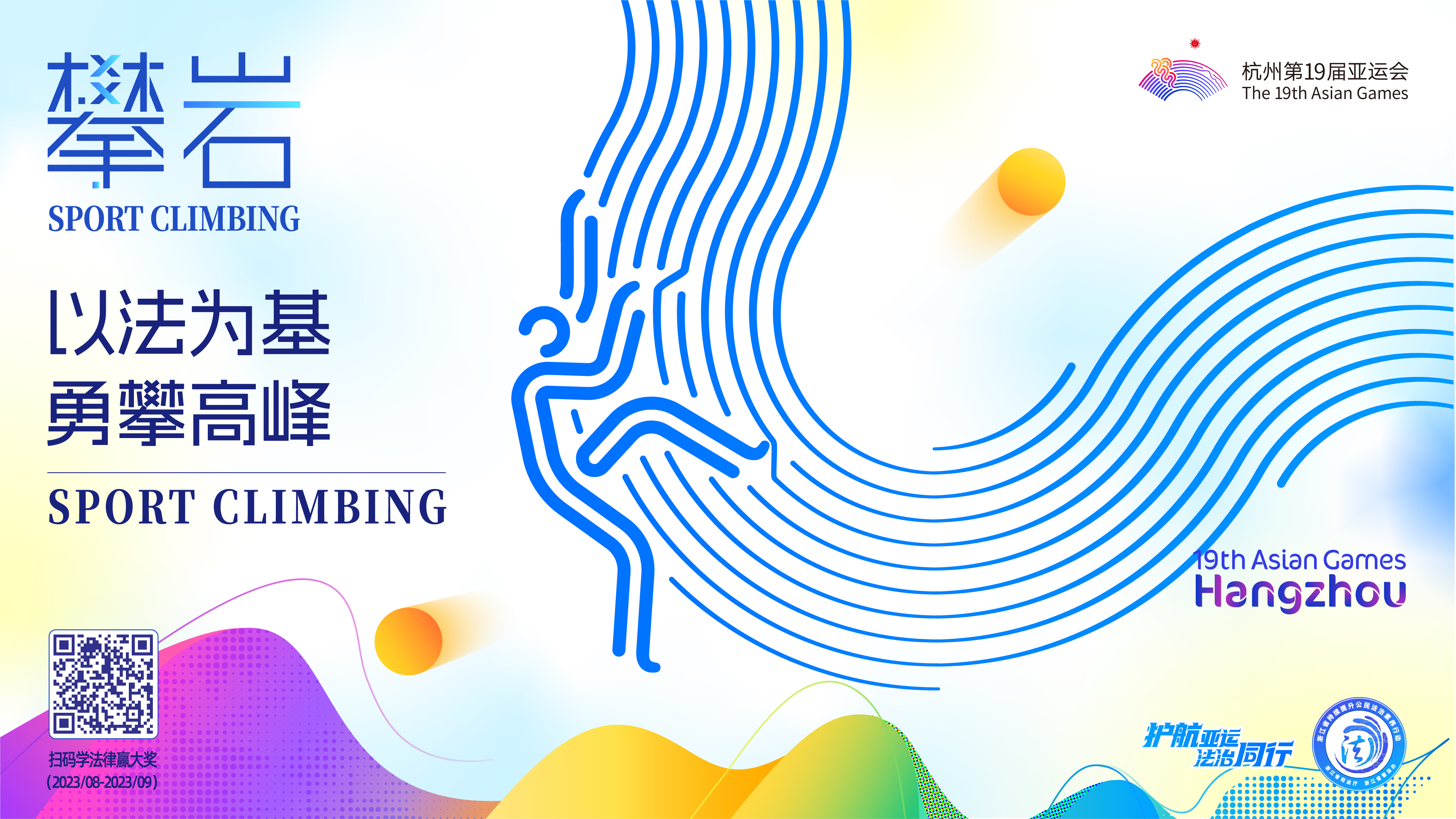 全套海報以“護航亞運法治同行”為主題,運用圖形、文字、色彩等元素,串聯(lián)起杭州亞運會元素、體育精神和法治精神,主題海報展示了亞運和法治的共通之處:守規(guī)則、重程序、維護公平與正義。配套海報從擊劍、蹦床、籃球、舉重、田徑、攀巖、游泳、賽艇等比賽項目中提煉出法治元素,使亞運和法治產(chǎn)生關(guān)聯(lián)和共鳴。