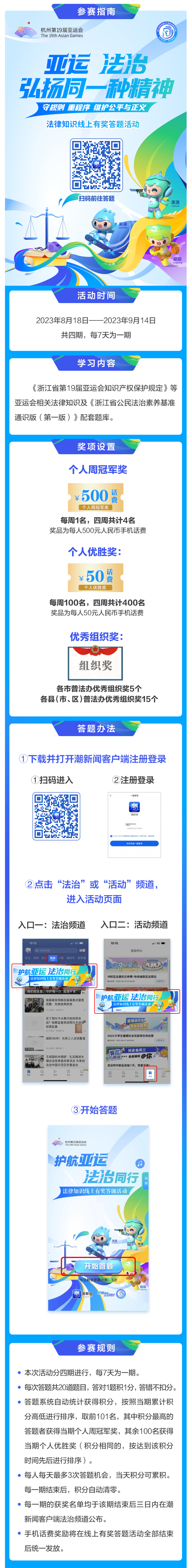 亞運法律知識線上有獎答題活動已于8月18日在“潮新聞”客戶端正式開啟,具體情況如下: