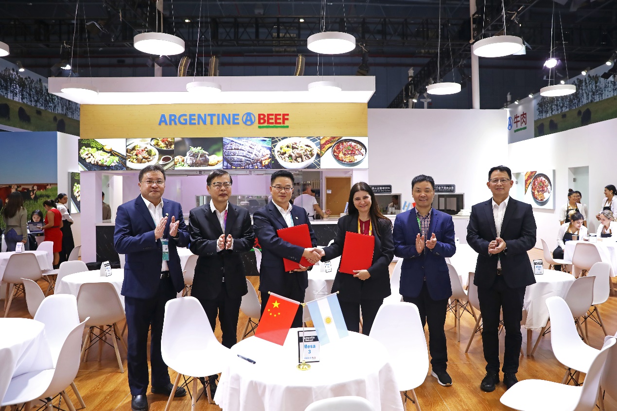 11月6日上午, 在省國貿集團黨委書記、董事長高秉學,黨委委員、副總經理張勇的先后見證下,浙江土畜分別參加浙江省交易團進口采購集中簽約儀式和展館現場簽約,與西班牙Litera Meat, S.L.U.、阿根廷Compania Bernal S.A.公司簽下2500萬美元豬肉進口訂單和2500萬美元牛肉進口訂單,兩單合計5000萬美元,較上屆進博會增長5%以上,為明年進口肉類業務穩定發展打下了堅實基礎。